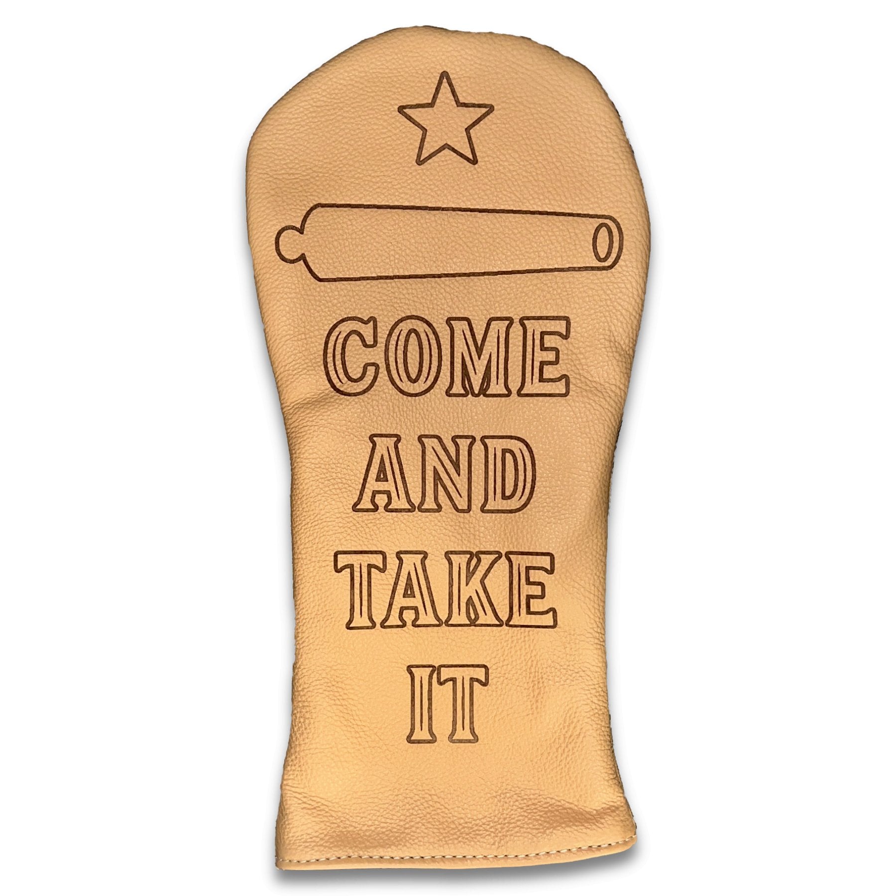 The Come And Take It Headcover is a tribute and celebration of Texas. The "Come And Take It" slogan at the top of the cover comes from the first battle in the Texas Revolution, the Battle of Gonzales. The Come And Take It Headcover features these two celebrations of Texas laser engraved on sandstorm GT-L. The cover is made to order in Texas. Driver, fairway and hybrid sizes are available.